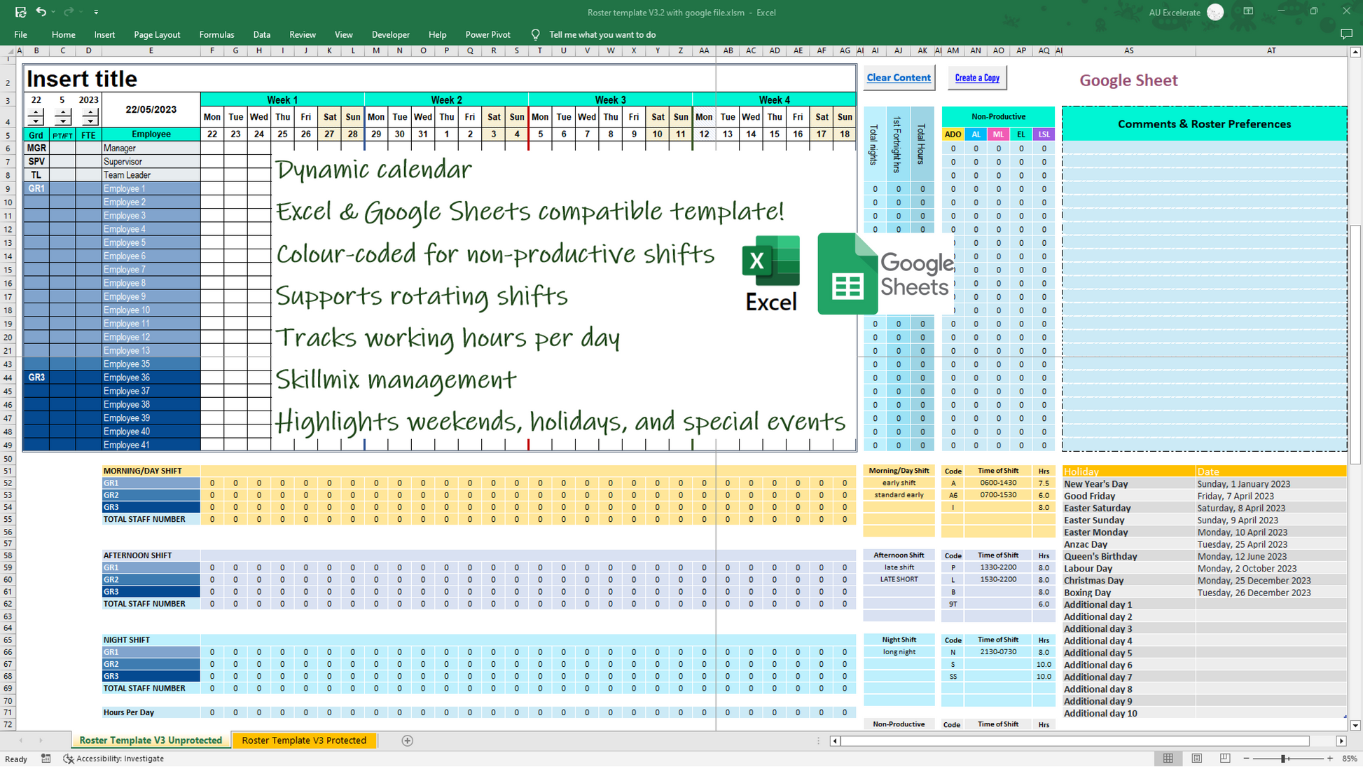 Excel & Google Sheet 4-Week View Employee Roster Template
